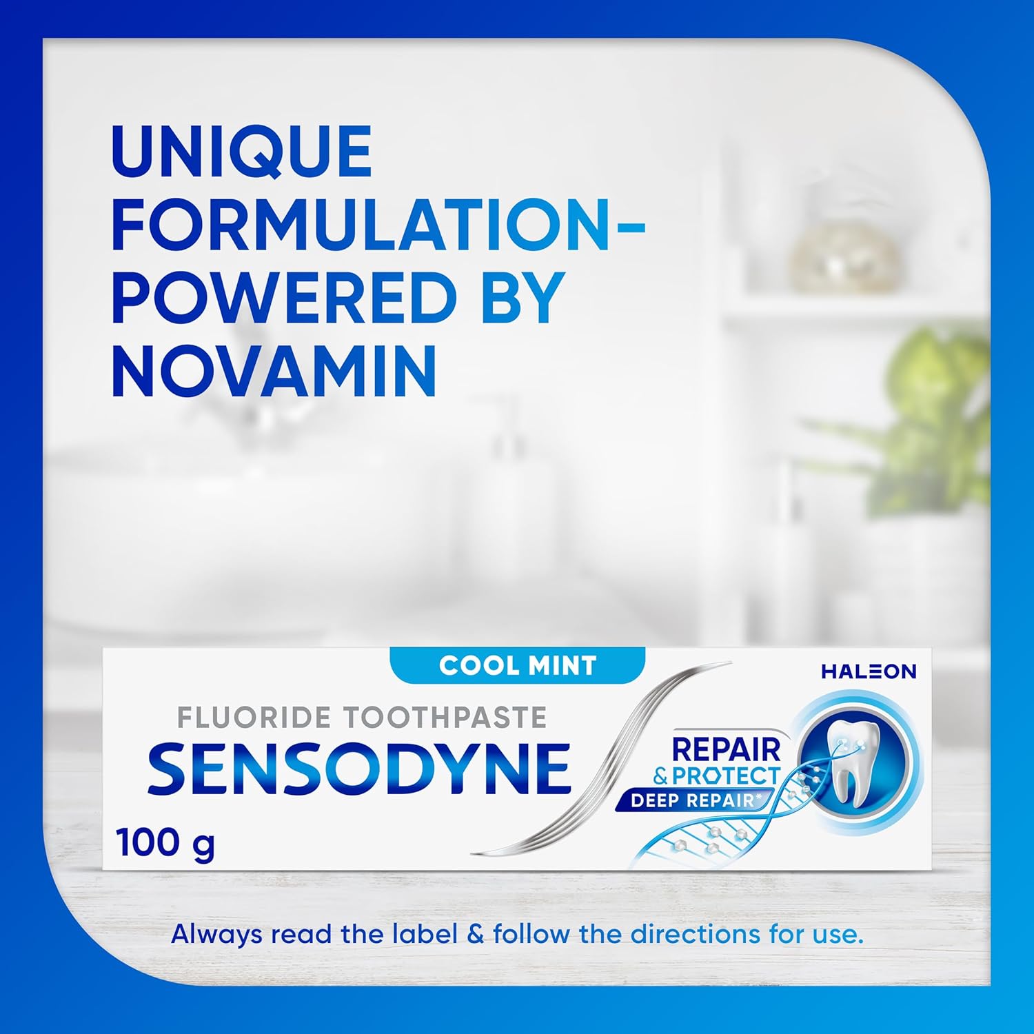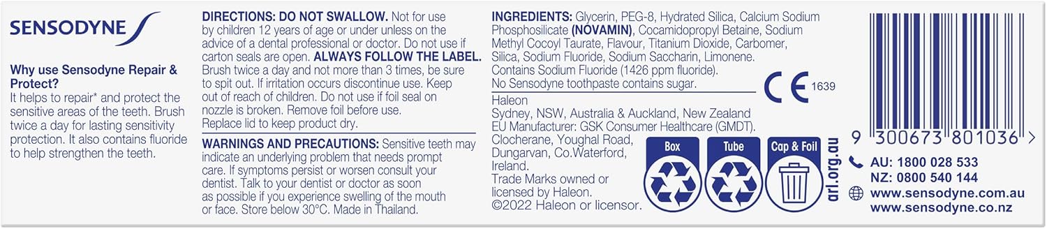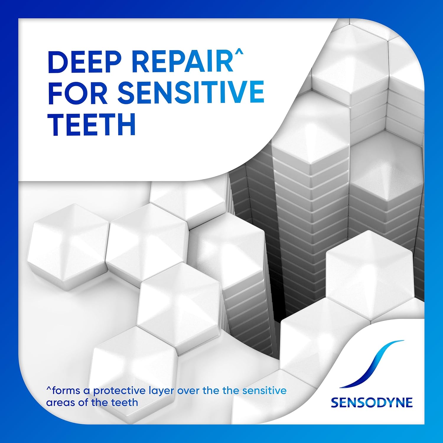 Sensodyne Repair & Protect Deep Repair* is a daily fluoride toothpaste that helps to repair* the sensitive areas of the teeth, with twice daily brushing.Sensodyne Repair & Protect, powered by NOVAMIN, is a calcium sodium phosphosilicate formulation. With twice daily brushing, it helps repair* sensitive areas with the natural building blocks of teeth.What is tooth sensitivity?Sensitivity can occur when the dentine underneath tooth enamel and gums becomes exposed. When exposed dentine comes into contact with hot or cold, sweet or sour, or even your toothbrush, it can trigger the nerve causing a short sharp pain.Why use Sensodyne Repair & Protect?It helps to repair* the sensitive areas of the teeth. Brush twice a day for lasting sensitivity protection. It also contains fluoride to help strengthen the teeth.*Forms a protective layer over the sensitive areas of the teeth. Brush twice a day for lasting sensitivity protection. ~With twice daily brushing.