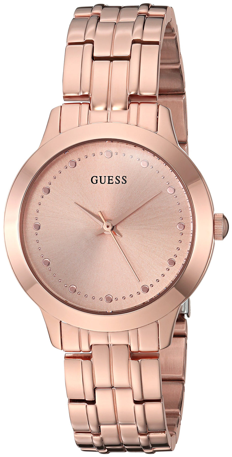 Watch Sizing Guide A petite silver-tone watch with a minimalistic dial and stainless steel buckle. The pairing of its slim case and minimalistic dial makes this silhouette perfect as an everyday watch. Stainless steel case. Stainless steel bracelet with fold-over, double push-button release. Round face. Three-hand analog display with quartz movement. Dial features silver-tone hands, hour markers, and Guess detailing. Water resistant. Display case included. Imported. Guess Watch Warranty Measurements: Case Height: 30 mm Case Width: 30 mm Case Depth: 9 mm Band Width: 9 mm Band Circumference/Length: 8 1⁄4 in Weight: 2.4 oz