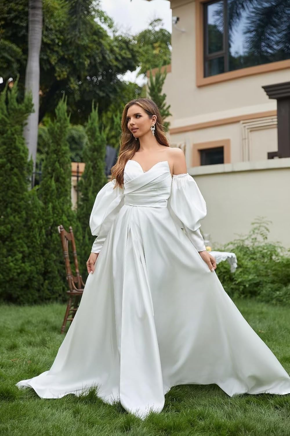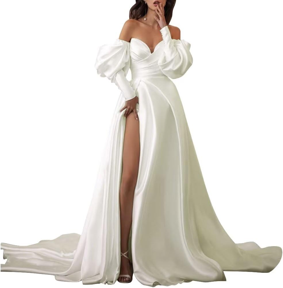 Off Shoulder Satin Wedding Dresses with Slit for Bride Detachable Puffy Sleeves Simple Bridal Gown A-line Prom Dress