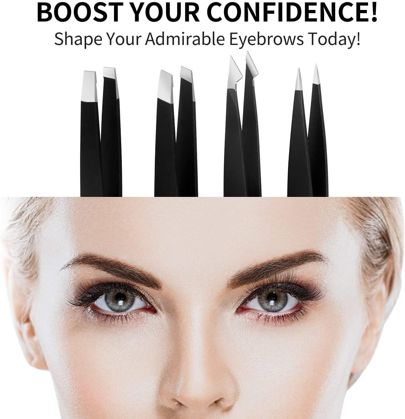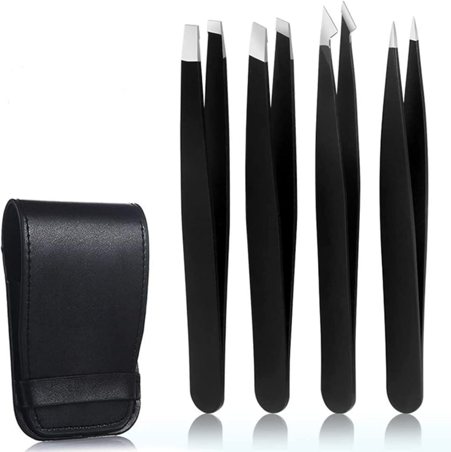 4 Pack Eyebrow Tweezers, Stainless Steel Slant Tweezer Set and Pointed Hair Removal Tweezers, Precision Tweezers for Ingrown Hair, Eyebrows Plucking, Daily Beauty Tool (black)