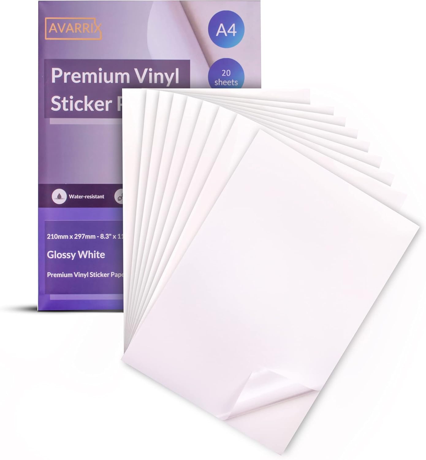 Avarrix Australia Printable Vinyl Sticker Paper for Inkjet Laser Printer, Glossy White, 20 Sheets, Waterproof Label Stickers, Printable Vinyl Sheets, Tear Resistant, Quick Dry Vibrant Colours, A4 Size