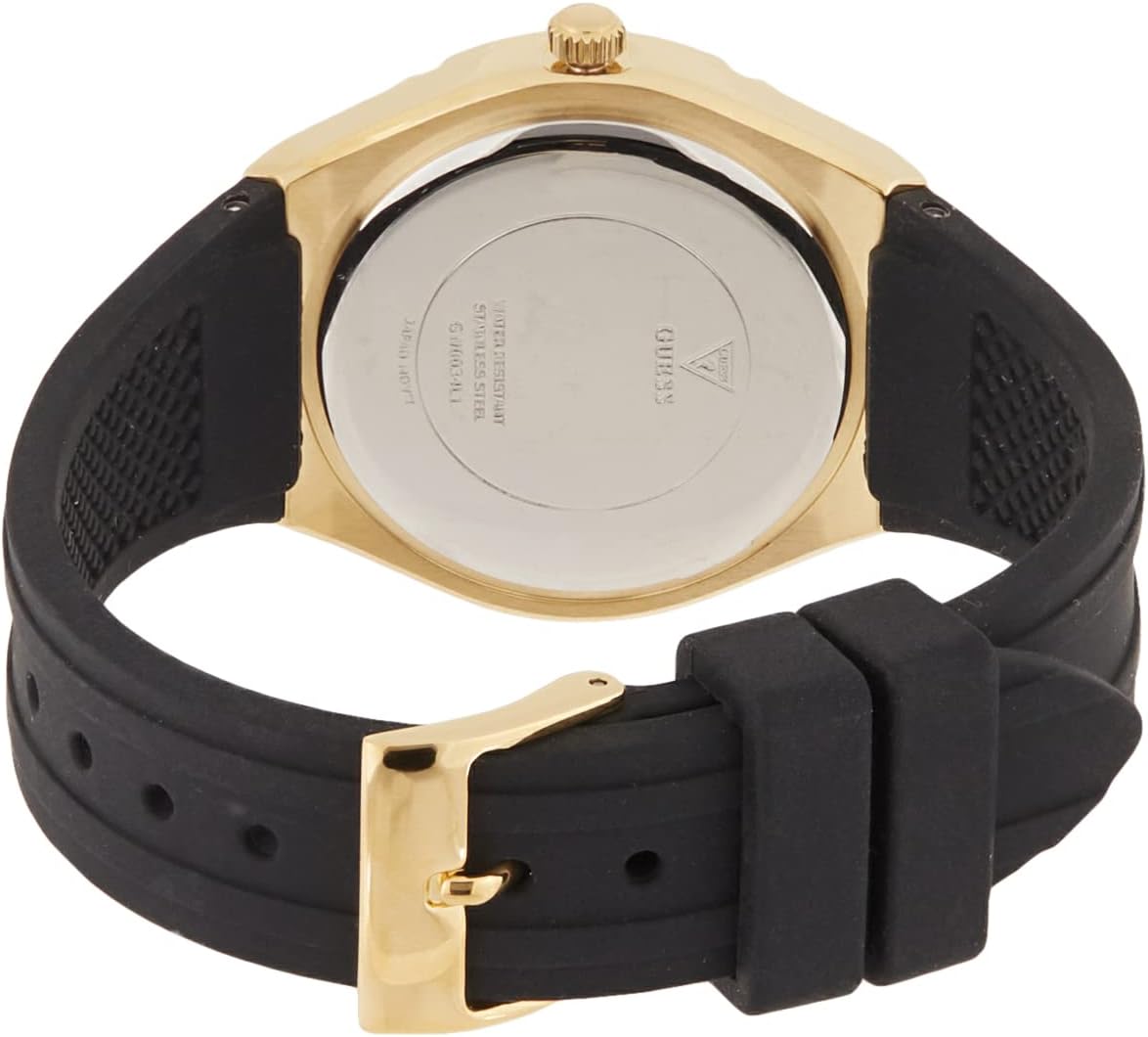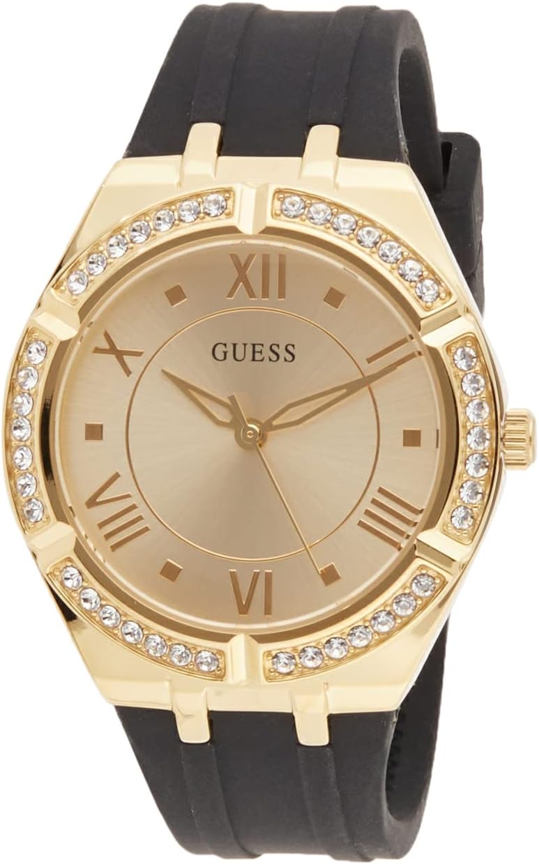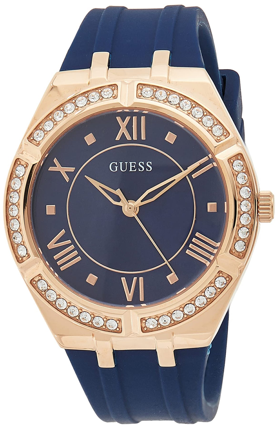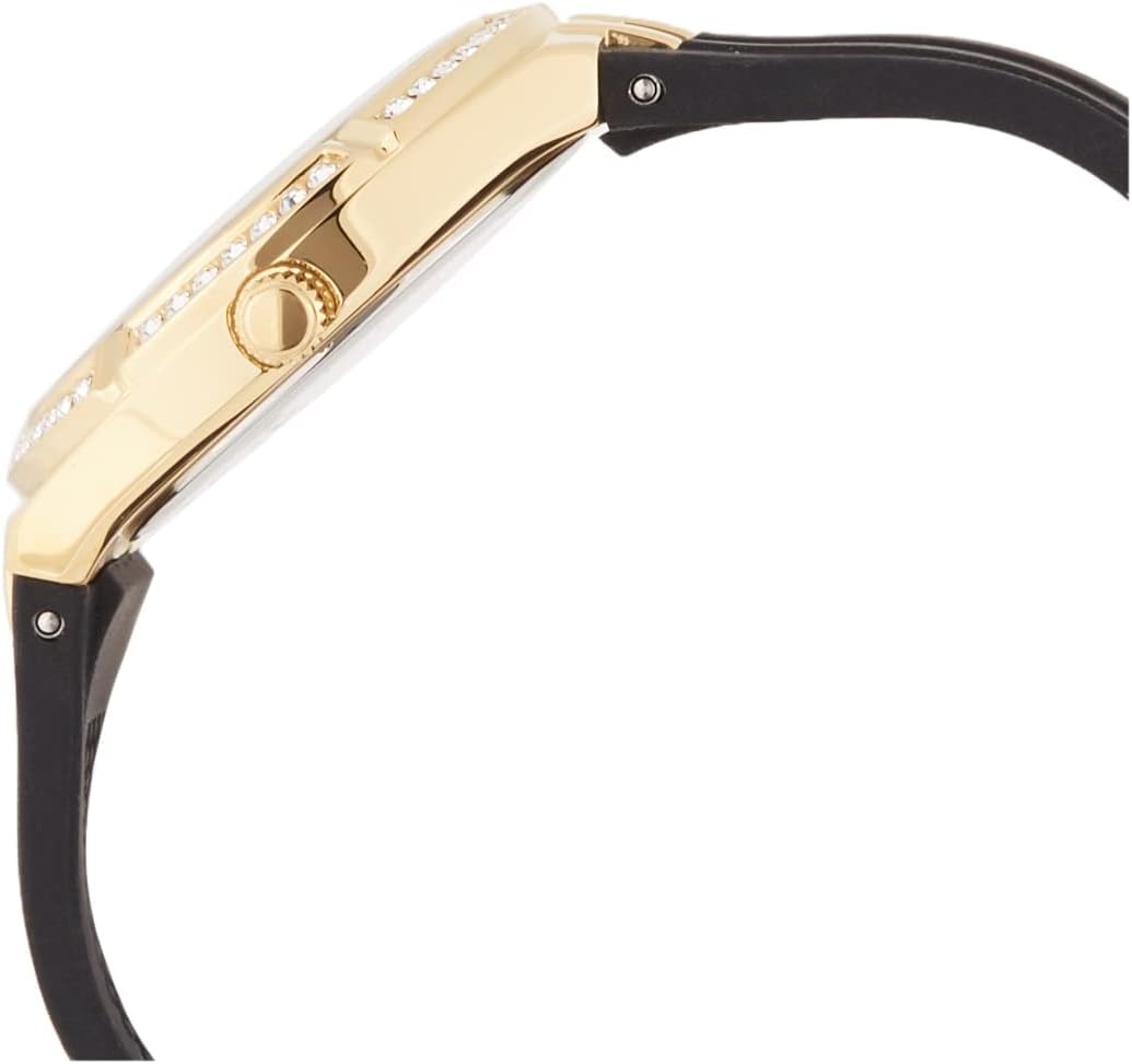 The perfect polished touch for any outfit, this rose gold-tone analog watch features a white sunray dial with a crystal-encrusted bezel, and a white silicone strap.