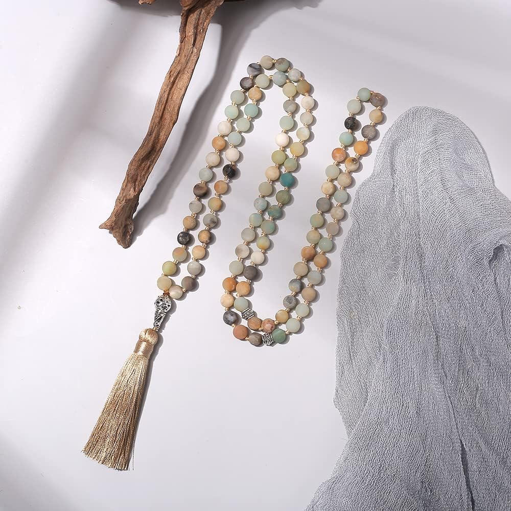 This jewelry is made of 99 matte amazonite stones, the stones are natural, so each bead will be a little different in size and color, but after our selection these errors are minimal. Each bead is separated from each other with a knot and every 33 beads are separated by a metal bead. This jewelry can be used as a necklace or as a bracelet, you can hold it in your hand when you pray!