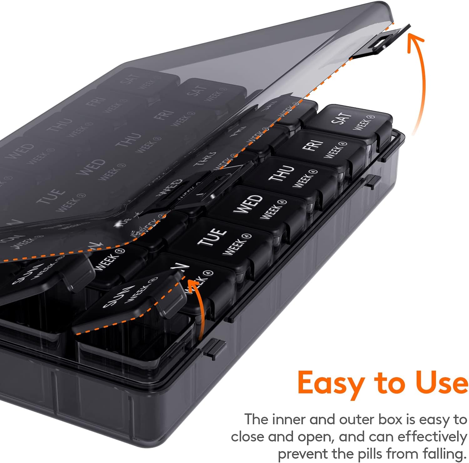 Easy to Use: The product consists of two parts: the outer box and the inner box. The outer box can fix all the inner boxes in place and this double box design will prevent the inner pill box from popping out. At the same time, the inner and outer boxes are designed with a flip cover, which is easy to open and close, and has good air tightness.