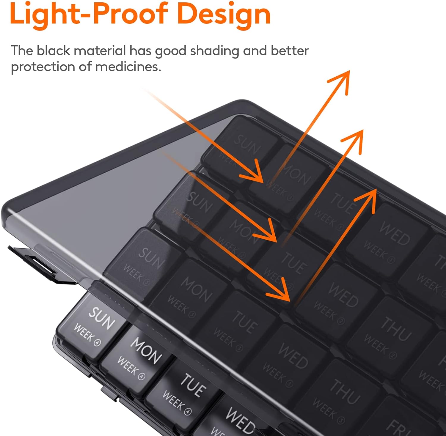 Monthly Medication Plan: Lifewit Monthly Pill Organizer comes with 4 individual weekly pill boxes for a total of 28 small pill boxes to organize 1 months' worth of pills at a time. You can instantly know if you have taken medicine that day and take your medicine on schedule. Ideal for people with multiple prescriptions.