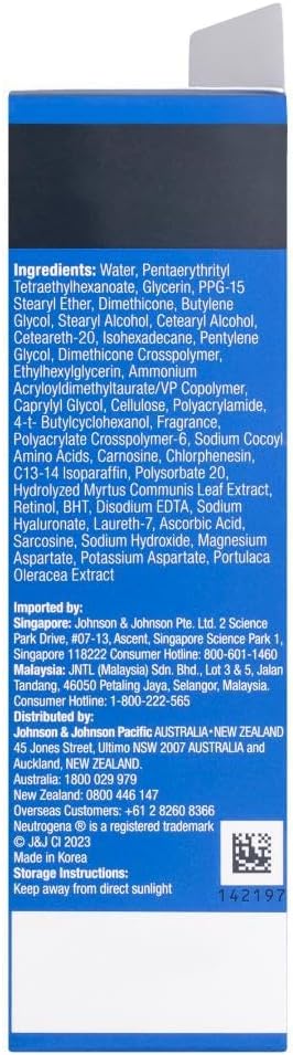 Ideal for a beginner retinol user, Neutrogena Visible Repair Retinol Night Moisturizer has 3x the anti-wrinkle power^ and is proven to reduce visible signs of skin ageing and damage caused by environmental aggressors, and is formulated with soothing ingredients for less skin irritation, even for new retinol users*. This lightweight formulation contains - Pure Retinol, a dermatologist-proven form of Vitamin A that helps to fade the appearance of fine lines, dullness and wrinkles. Our patented technology delivers retinol slowly within skin's surface to help minimise the potential for irritiation. - Carnosine, a proven antioxidant to protect skin from oxidative stress and help improve skin's firmness and elasticity. - Comfort Complex, soothing ingredients to minimise skin discomfort. Clinically proven results In 1 week: - Visibly reduce fine lines around cheek, forehead wrinkles, glabellar lines, masoclabial folds, marionette wrinkles, smile wrinkles and neck lines. - Skin is hydrated, smoother and more radiant. ^vs previous formula *Women who had not used retinol products in the prior 3 months.