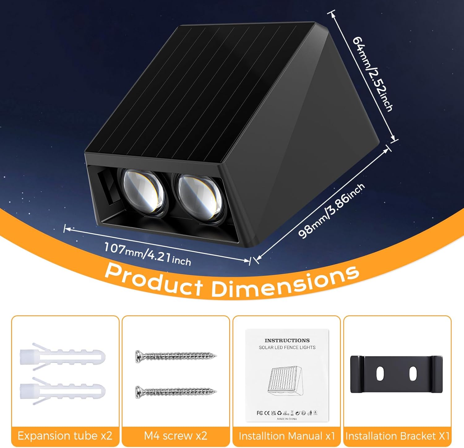 • 【Easy Installation】The wireless RGB wall lights come with installation kits such as screws, plugs, and drilling templates, making installation easier. Note: Please ensure that the solar fence light is installed in a sunny place and not in a shaded area. To achieve the best lighting effect, we recommend cleaning the surface of the solar panel every 3-4 months to remove dust or dirt.