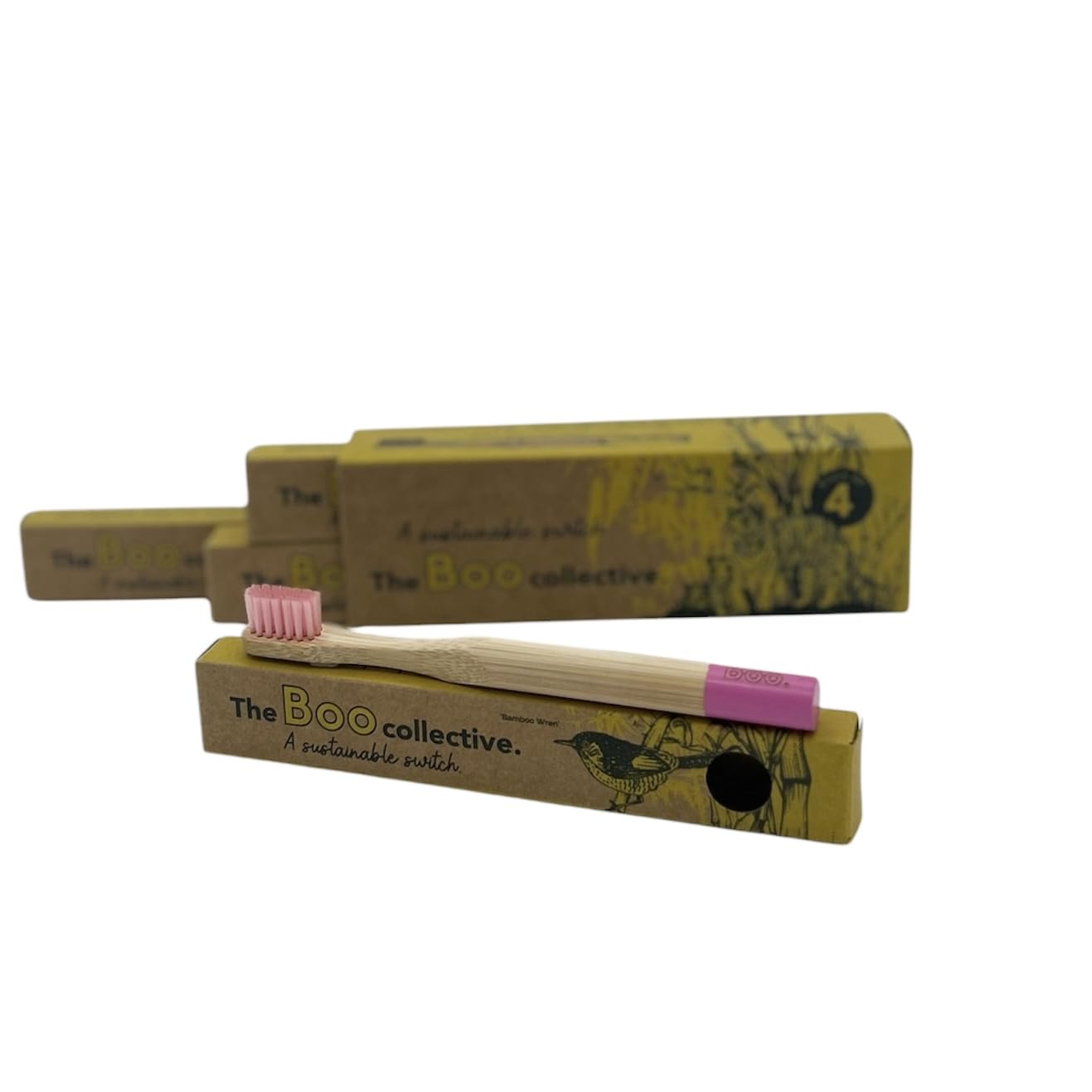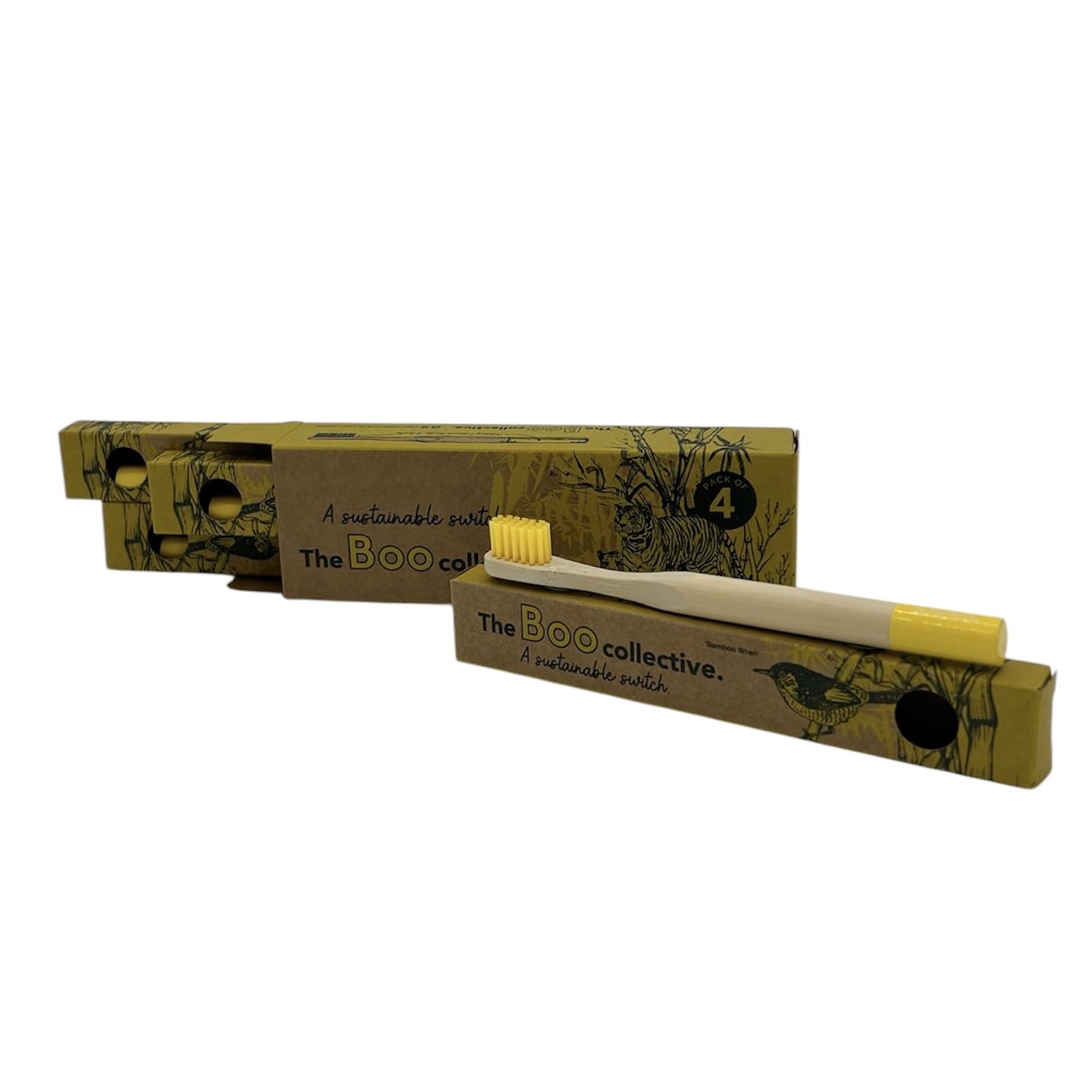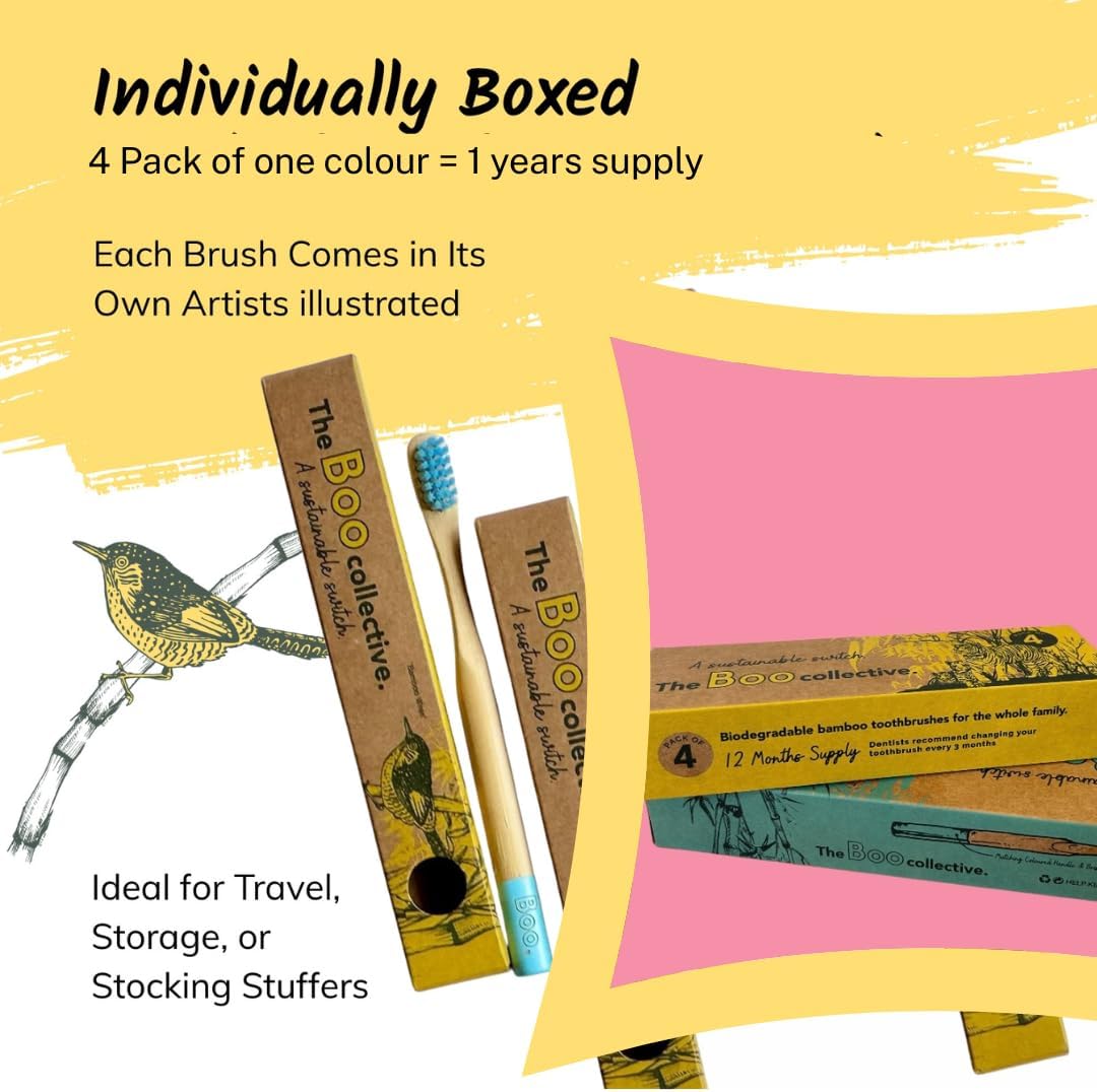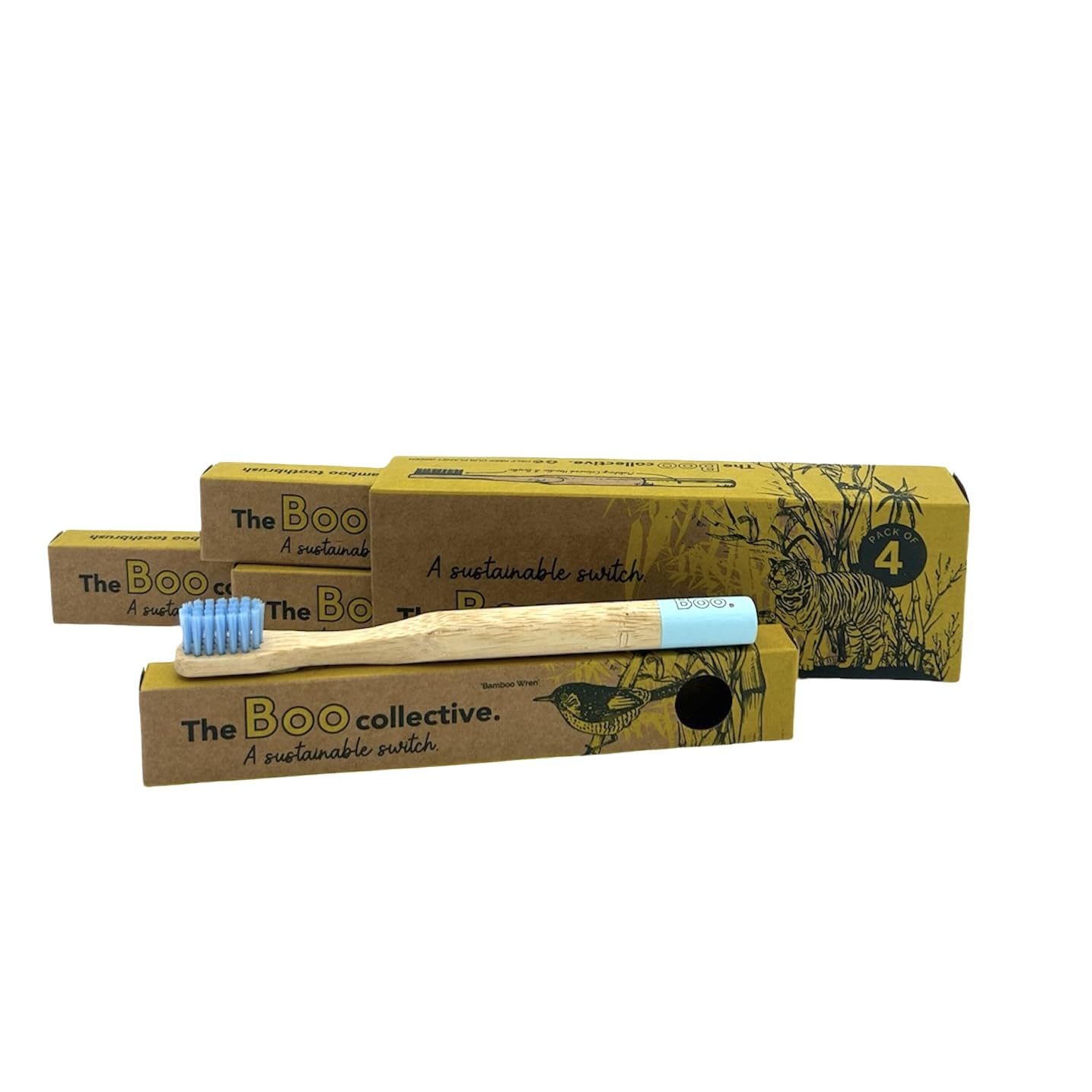 Keep your teeth clean and the planet green with The Boo toothbrushes. Bamboo really is the perfect sustainable material to make toothbrushes from! Did you know bamboo is actually a grass? And it's one of the fastest growing plants on the planet. The Boo toothbrushes are soft and smooth, and comfortable in the mouth, made with a 100% biodegradable round Bamboo handle and Vegan friendly Nylon 4 bristles. Our children's toothbrushes have matching coloured handle and soft bristles, available in 5 funky colours; so there will be no mixing them up with the rest of the family! Dentists recommend you change your toothbrush every 12 weeks, so this 4 pack will give you 12 months supply. Go green and switch to The Boo toothbrushes today!